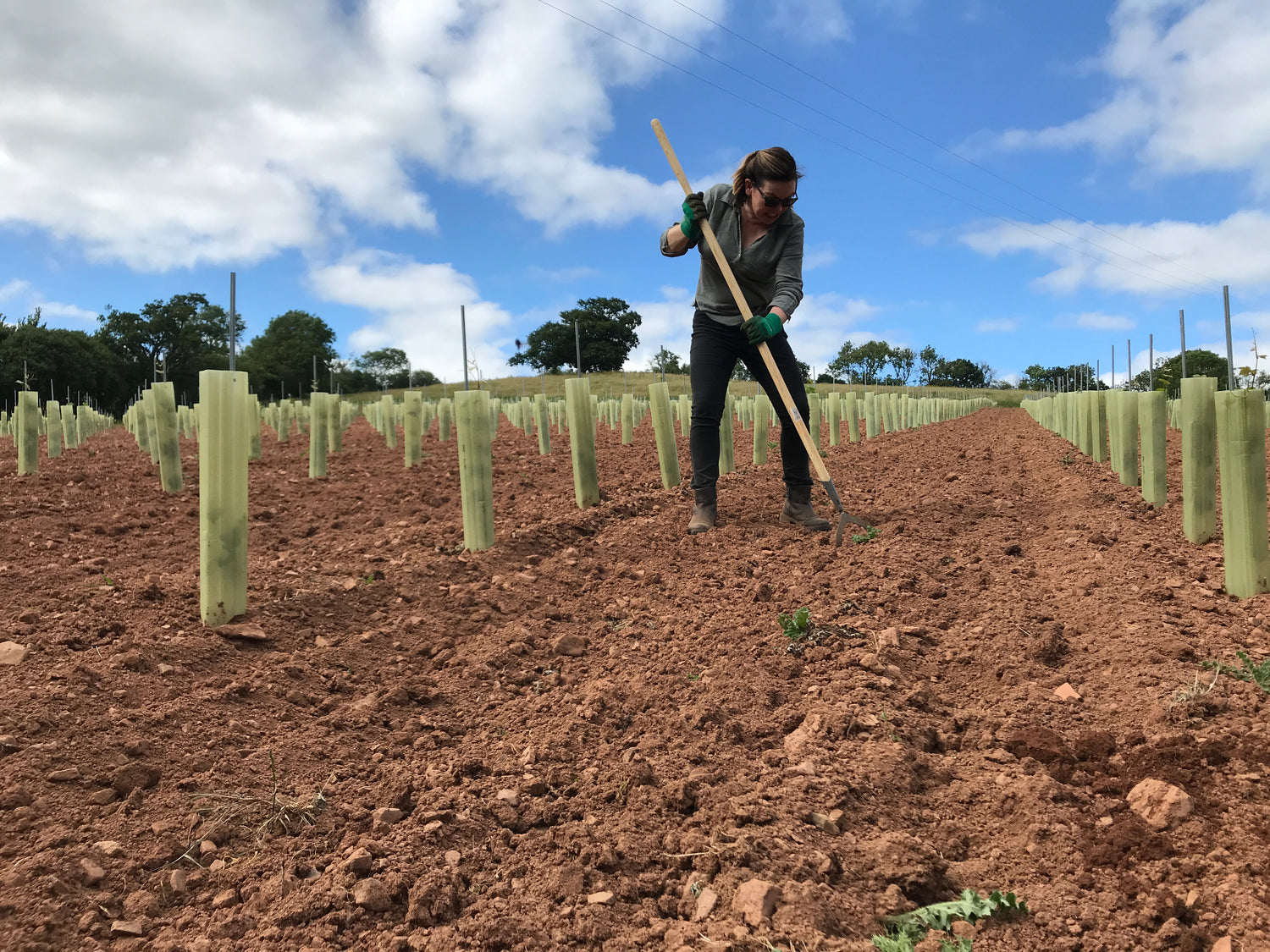 Our focus was always going to be sustainability, respecting the environment and avoiding chemicals on site. So, in 2018, in preparation for planting, instead of spraying herbicide to kill off the grass, we chose to turn over the soil instead. Over winter the grass would die off thus our beautiful soil stayed healthy and abundant.